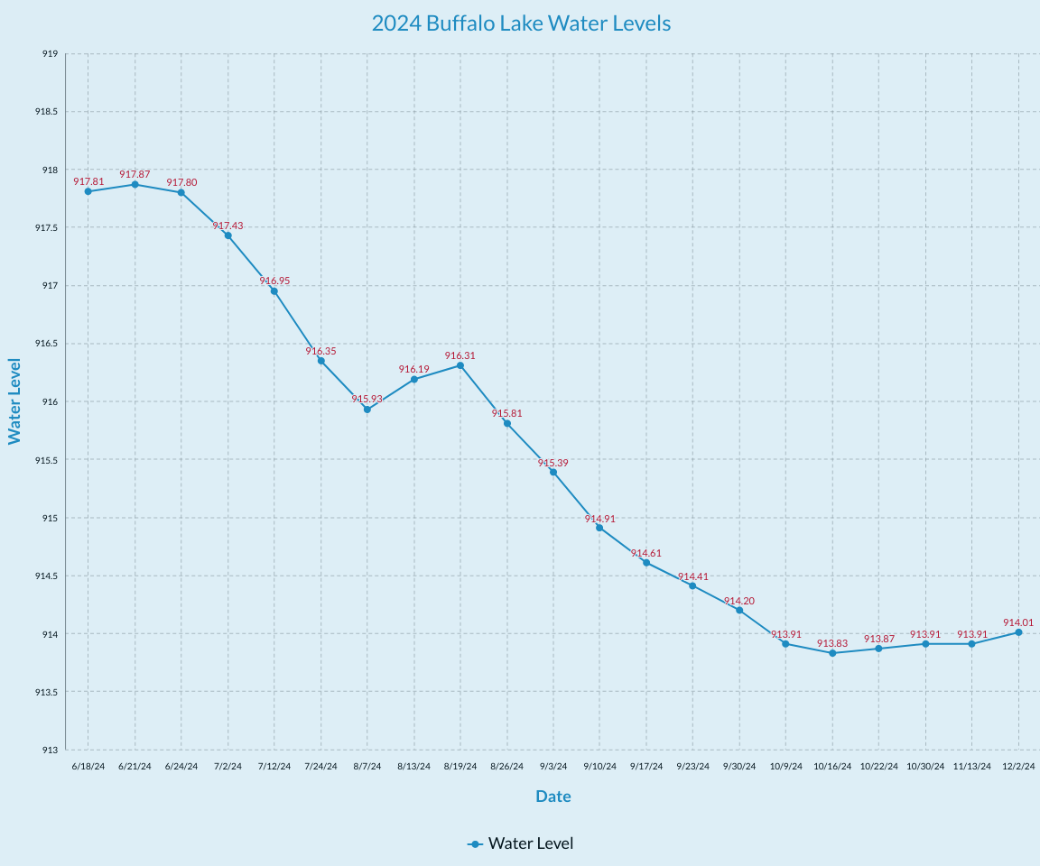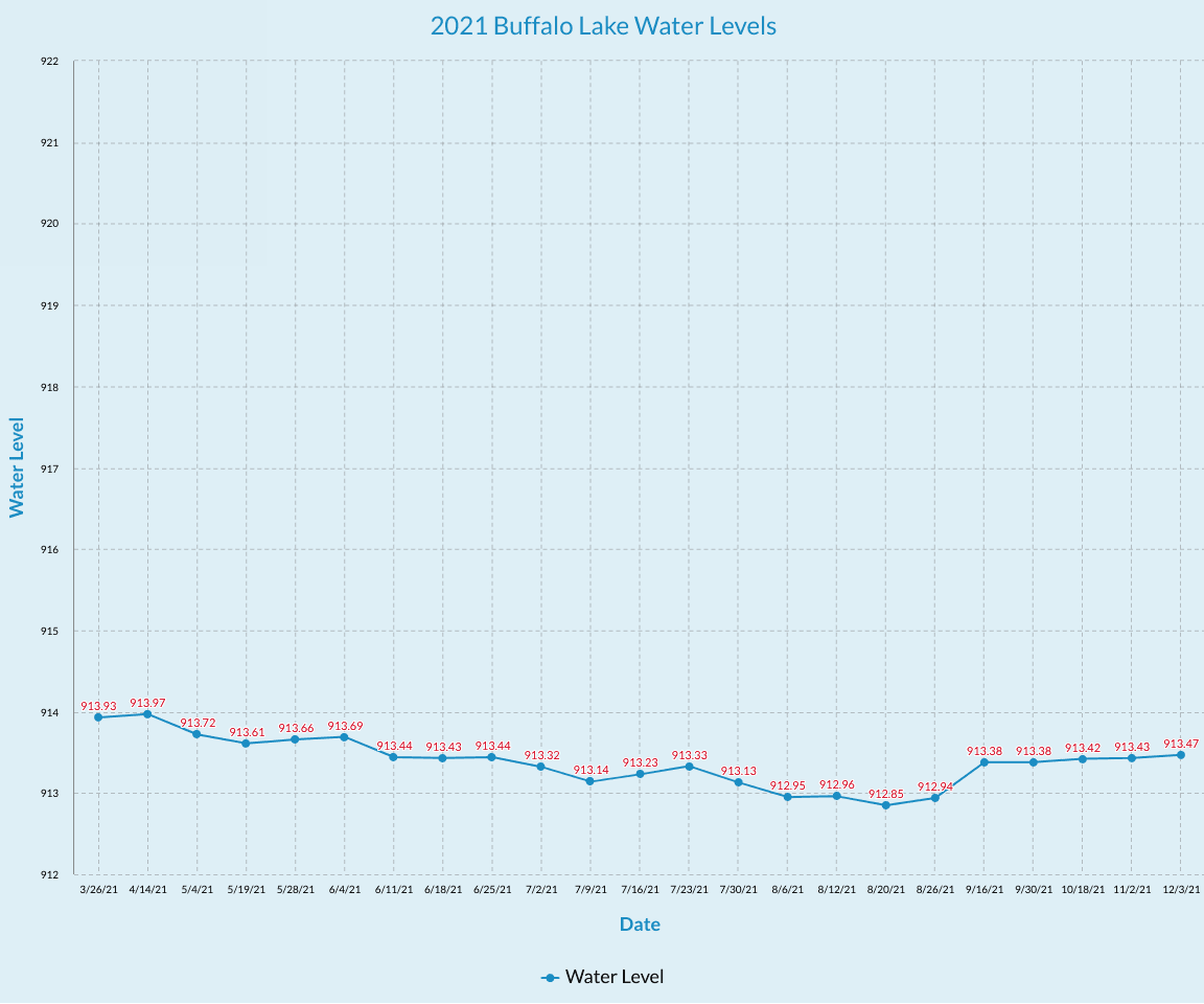 Water lake levels are monitored on Buffalo Lake periodically from "Ice Out" to "Ice In" every year. A summary of historical data from 2025 through 2020 is available below.
